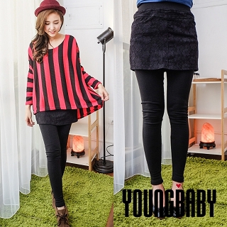 【YOUNGBABY中大碼】蕾絲口袋裙刷毛加大裙褲(黑)