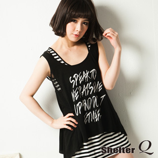 【Shelter Q】無袖兩件式條紋x英字鏤空罩衫(黑)