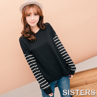 【SISTERS】蝙蝠袖拼接條紋T恤上衣(黑色)