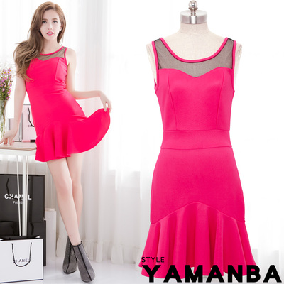 千頌伊款低胸網紗拼接魚尾洋裝 桃紅-Yamanba商品網址: