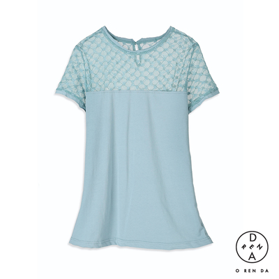 ORENDA-縷空蝴蝶結蕾絲短袖上衣-水藍