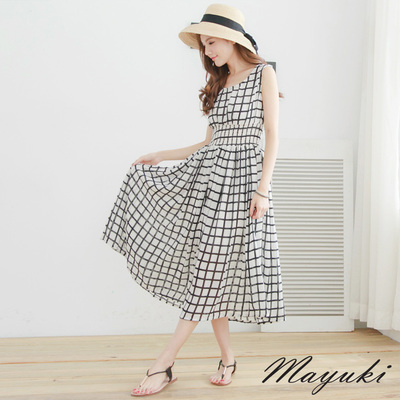 東京著衣-MAYUKI 黑白配色線條格束腰長洋裝(共二色)