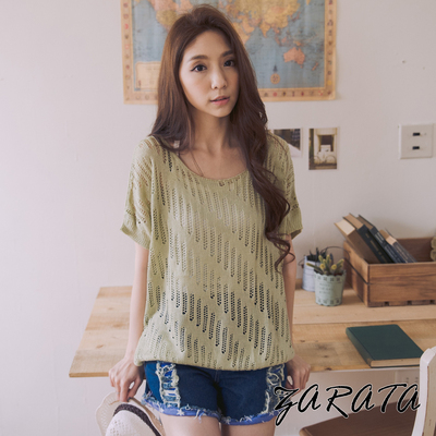 罩衫-圓領純素面斜紋短版針織上衣-草綠-ZARATA商品網址: