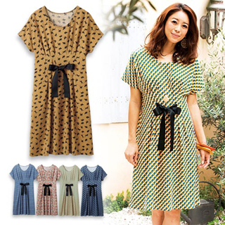 【現貨 日本portcros】日本Portcros 蝴蝶結短袖連身印花洋裝(幾何花樣-3L)