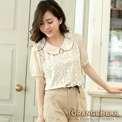 - OrangeBear-珍珠領蕾絲網紗上衣