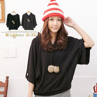 【S-7L熊衣褲語】毛茸連帽抽繩毛球短版七分寬袖上衣X138(黑、灰S-L)
