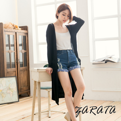 素面開襟後簍空V棉質長版外套(黑色)-ZARATA