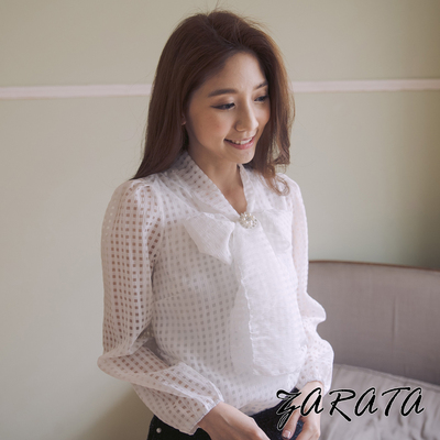 【ZARATA】襯衫-蝴蝶結珍珠格子紋微透襯衫-白
