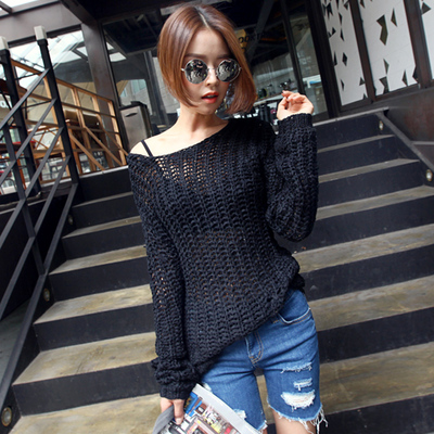 鏤空破洞圓領長袖針織衫上衣(黑) iFashion商品網址: