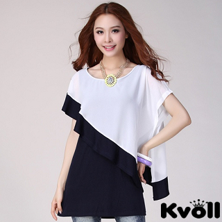 【KVOLL大尺碼】藍色斜邊荷葉袖拼色假兩件雪紡衫