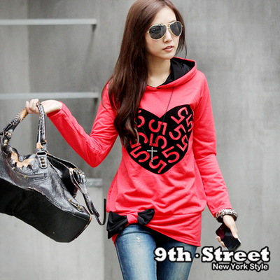 【9th.Street】蝴蝶結抓摺長版連帽上衣(紅)