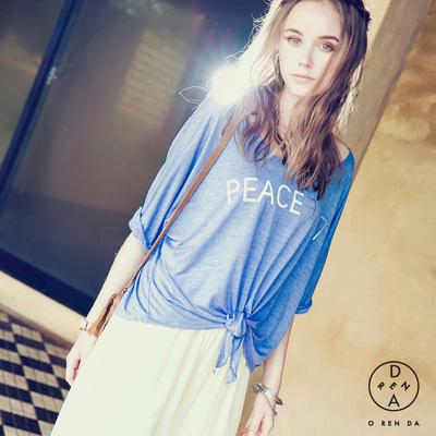 ORENDA-印字寬鬆慵懶綁結上衣-藍