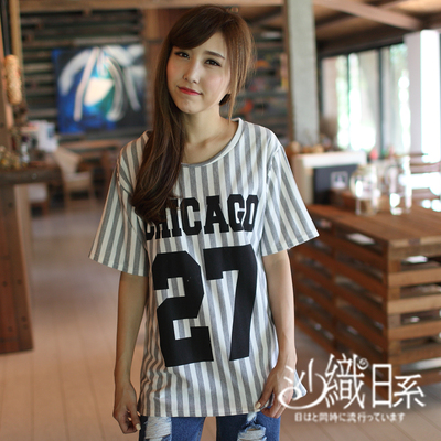 CHICAGO 27字母造型直條紋上衣(灰)-沙織日系