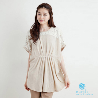【earth music】蕾絲拼接飛鼠5分袖長上衣-米色(18133G81010123106)