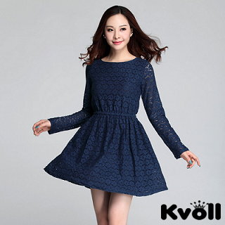 【KVOLL大尺碼】藍色後背縷空蕾絲連衣裙