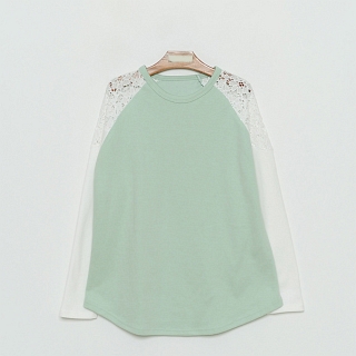 【OB嚴選】鏤空蕾絲拼接袖圓領棉質上衣‧共三色
