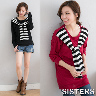 【SISTERS】假條紋披肩棉質長版上衣(共二色)