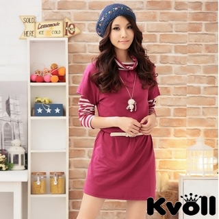 【KVOLL中大尺碼】紫色假兩件式條紋修身長袖連衣裙