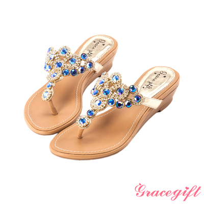 Grace gift度假之屢-璀璨異國圓寶石綴鑽夾腳涼鞋 藍商品網址: