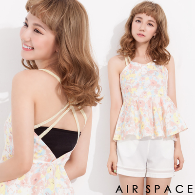 AIR SPACE 細肩交叉肩帶彩色花朵背心上衣(甜美粉)