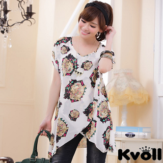 【KVOLL大尺碼】白色印花不規則寬鬆雪紡衫上衣