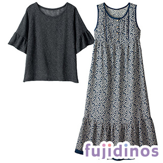 像波浪般的透明花樣涼爽針織罩衫及柔軟布料印花洋裝組合,罩衫袖口荷葉設計修飾手臂線條。