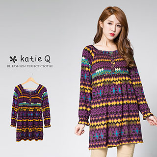 【-katie Q-中大尺碼】異國圖樣針織長版上衣L-XL(紫色款)