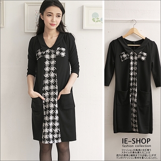 【IE-SHOP】千鳥紋造型剪接口袋洋裝
