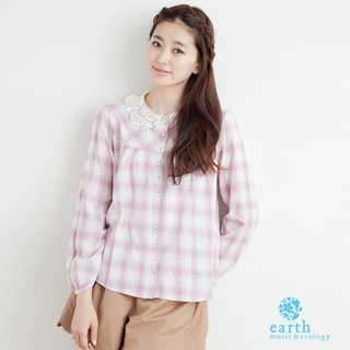 【earth music】溫柔小花蕾絲格紋造型上衣-粉紅色(14133A41020114102)