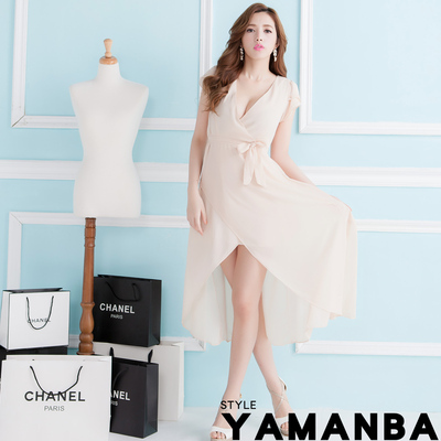 粉杏色大深V綁繩燕尾長洋裝-Yamanba