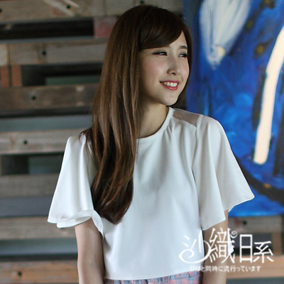 上肩網紗荷葉袖短版上衣(白)-沙織日系