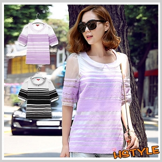 【創翊韓都】蕾絲上衣-翻領條紋繡花短袖蕾絲衫JP4105(現貨+預購)