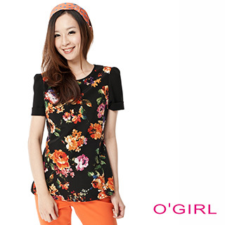 【OGIRL】特殊韓系印花拼接素布短版上衣(黑色)