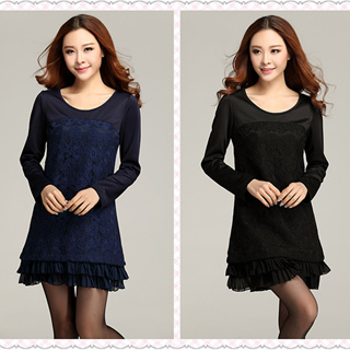 【菟絲花】壓摺傘擺蕾絲假兩件連衣裙(大尺碼)