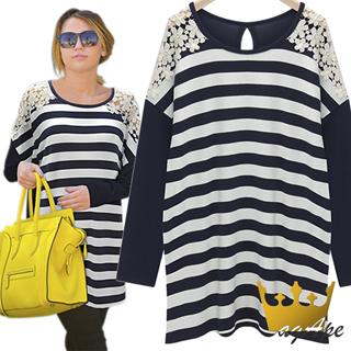【預購agApe】蕾絲肩條紋連身裙(共三色)