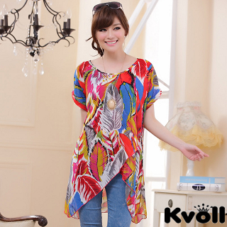 【KVOLL大尺碼】紅色羽毛不規則寬鬆雪紡衫上衣