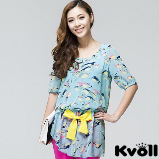 【KVOLL大尺碼】藍色小鳥印花不規則下擺雪紡衫