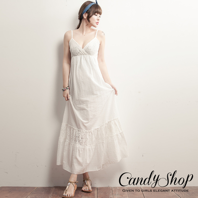 CANDY小舖 低胸細肩帶可調配蕾絲素長洋裝(白色)