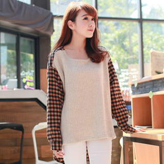 【現貨 IKODE】假兩件格紋拼接針織上衣(紅、 黑白 、咖啡)