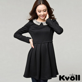 【KVOLL中大尺碼】黑色氣質顯瘦珍珠領連衣裙