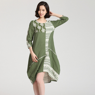 【菟絲花】印花棉麻拼接不規則寬鬆長款連衣裙(大尺碼)