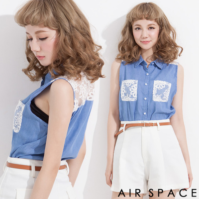 AIR SPACE 蕾絲拼接無袖丹寧感綿麻襯衫