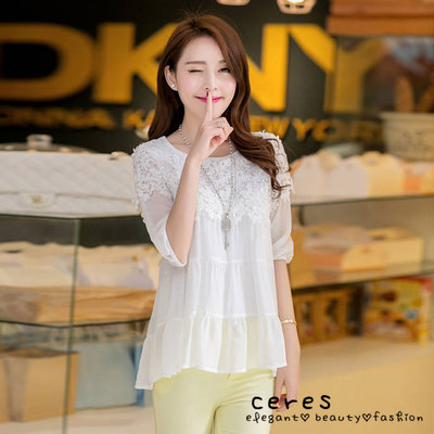 韓版蕾絲顯瘦雪紡五分袖上衣-Ceres席瑞絲