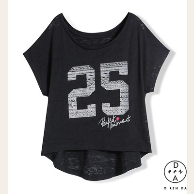 ORENDA-蕾絲數字印花竹節布上衣-黑