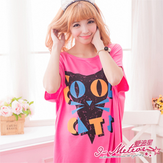 【I-meteor中小資財商開發顧問雲大尺碼】創意色塊貓咪印圖長上衣PA1613(繽紛桃)