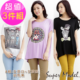 【名模衣櫃中大尺碼】組-修身剪裁可愛女孩印花Tee3件組(共3組可選擇-Free Size)
