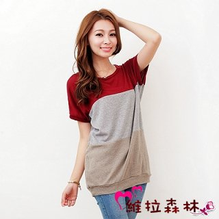 【維拉森林中大尺碼】棗紅色撞色拼接長版上衣
