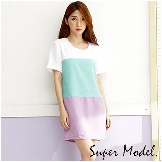 【名模衣櫃中大尺碼】三段式氣質拼貼圓領洋裝(白綠紫)