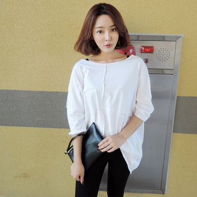 拼接寬鬆七分袖純棉短袖上衣(白) iFashion