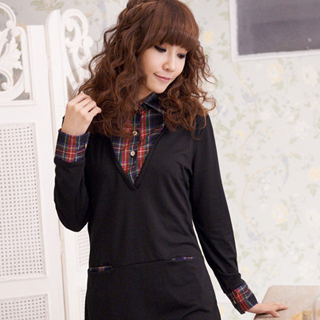 【S-7L熊衣褲語】格紋襯衫領假兩件雙口袋V領長版上衣A112(黑、藍S-2L)商品網址: http://www.momoshop.com.tw/goods/GoodsDetail.jsp?i_cod...